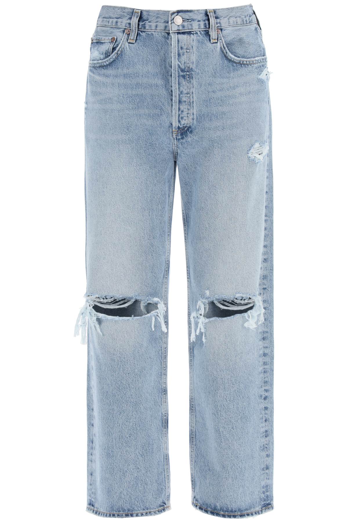 These 90's Agolde jeans are made from organic cotton denim with a medium wash and distressed details. They feature a five-pocket design with hidden button closure, belt loops, mid-rise waist, and a relaxed fit. The model is 187 cm tall and wears size 31.