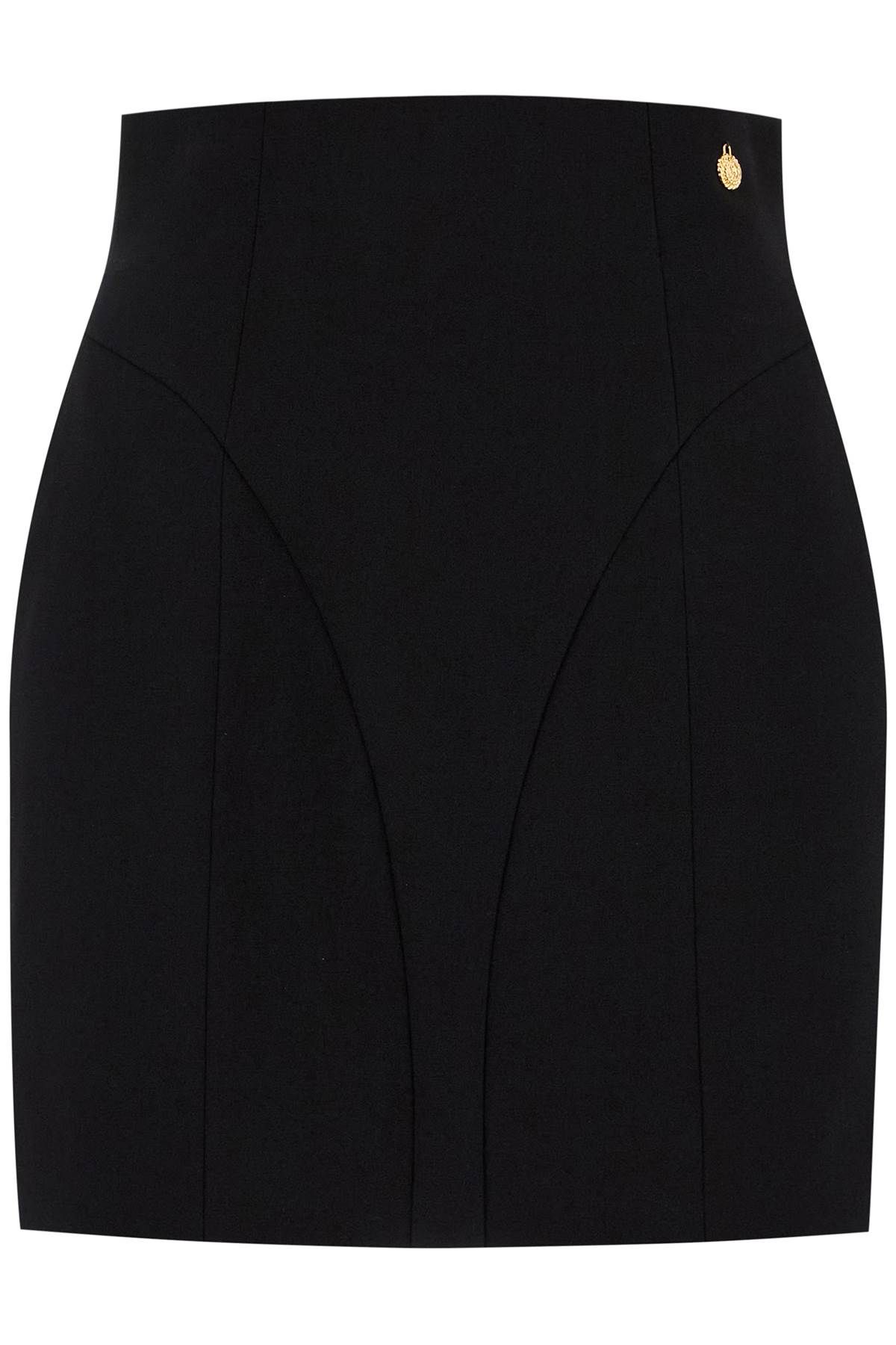 The Balmain mini skirt features a fitted high-waisted silhouette, made of viscose crêpe with a "Lion Head" charm on the side. It is fully lined and has an invisible zip closure on the side. The model is 177 cm tall and wears a size FR 36.