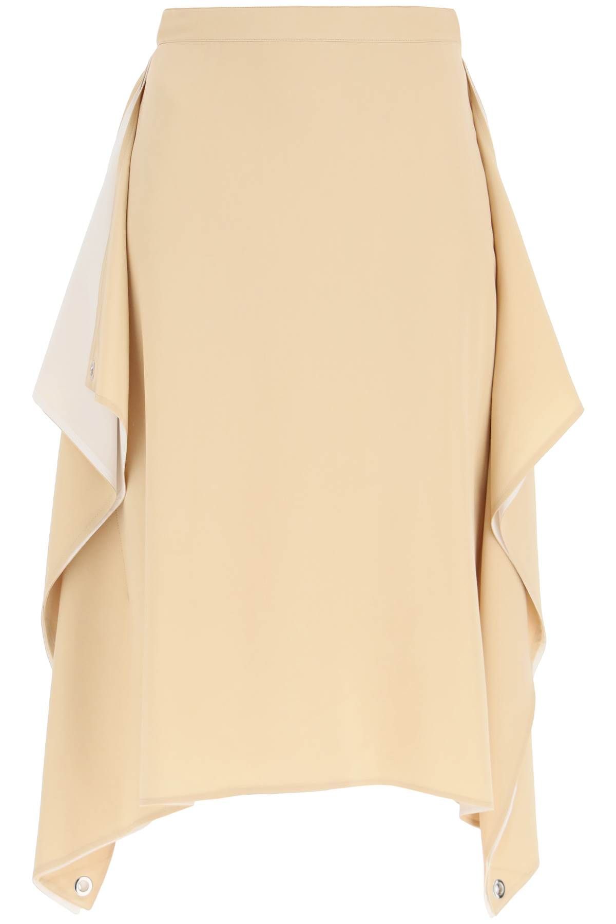 Burberry midi skirt in double pure silk crepe with contrast interior, embellished with draped panels on the sides and finished with metal eyelets. Back invisible zip closure. The model is 177 cm tall and wears a size UK 6.
