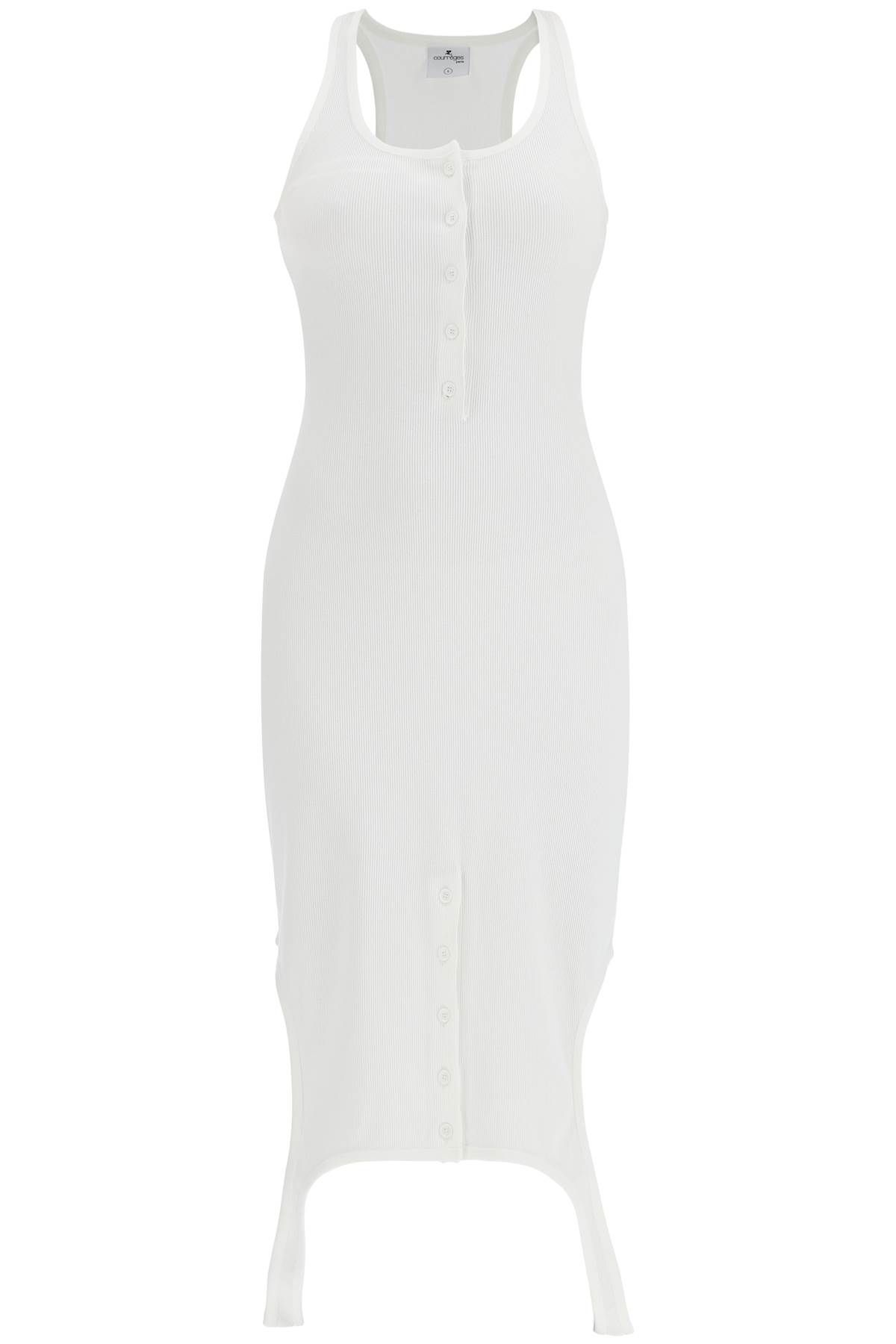 This midi dress by Courreges is made of ribbed knit fabric with a wide neckline, partial button closure, and mirrored bottom that replicates the bodice. It has a fitted silhouette and the model is 177 cm tall and wears size S.