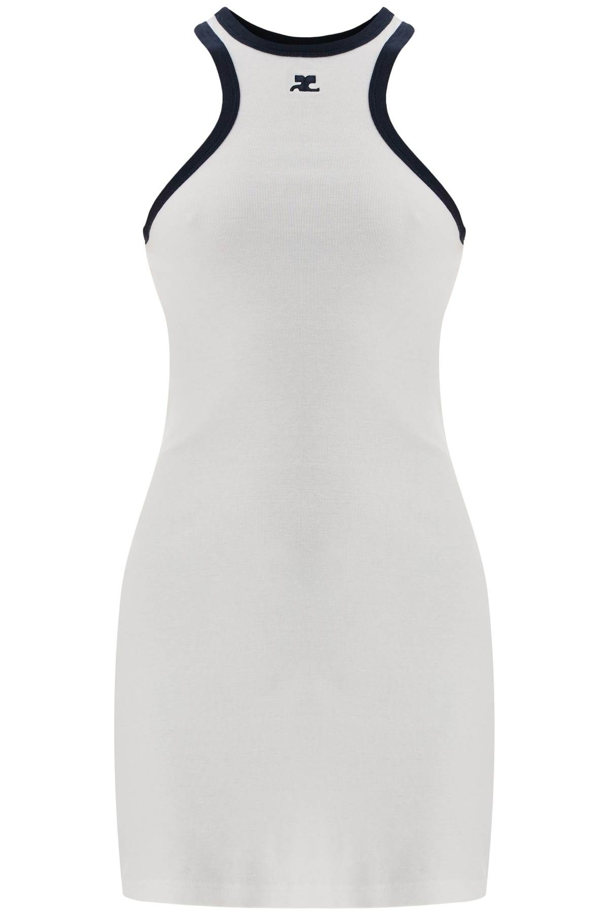 The white mini dress COURREGES offers timeless elegance. In 100% cotton with navy blue details and halter neck, it enhances the female figure. Perfect for casual and formal occasions.