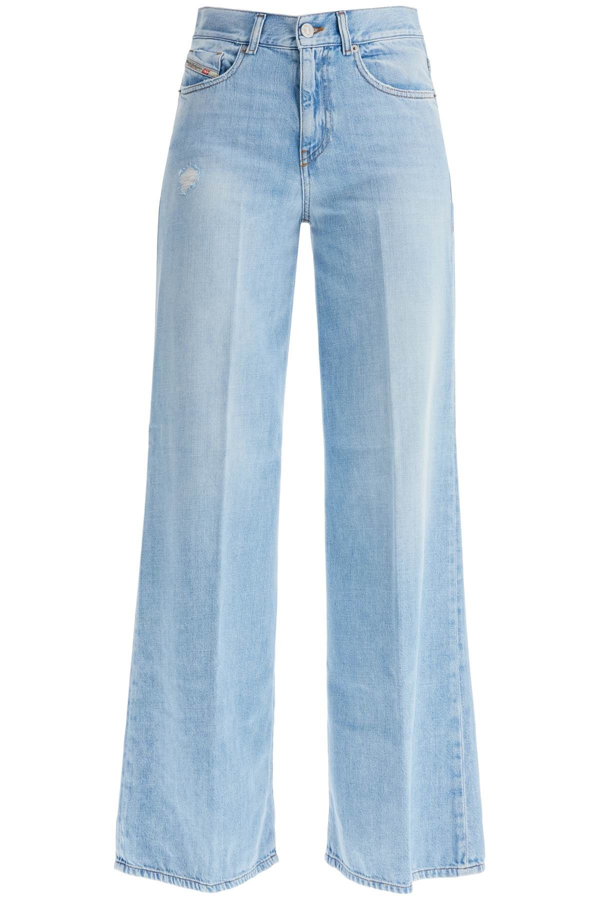These Diesel five-pocket jeans are made of lightweight cotton blend denim in a light wash. They feature a regular waist with a fitted silhouette on the hips that widens from the thigh to the ankle, creating a flared cut. The leather jacron and subtle destroyed details add a touch of style. The model is 177 cm tall and wears size 26.