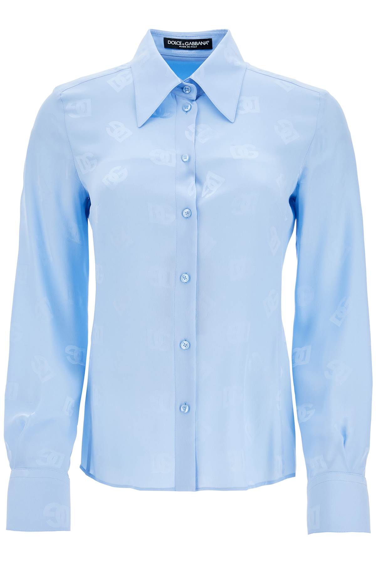 This Dolce & Gabbana long-sleeved shirt features a slim silhouette and is made of pure silk jacquard with an all-over DG logo pattern. It has a classic design with a pointed collar, front button closure, and straight cuffs. The model is 177 cm tall and wears size IT 40.