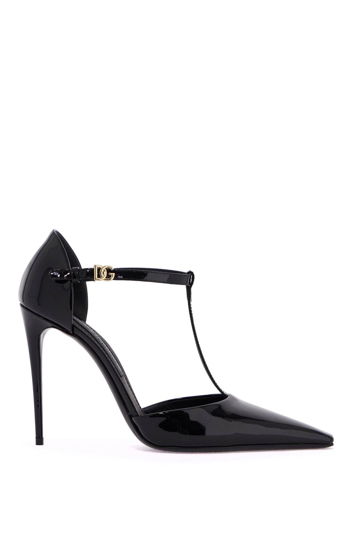 The T-bar Décolleté by Dolce & Gabbana, from the Mun line, is made of patent leather and adorned with a golden metal DG logo on the adjustable ankle strap. The design features a pointed and squared toe and a covered stiletto heel, complete with leather lining and insole and a leather sole.