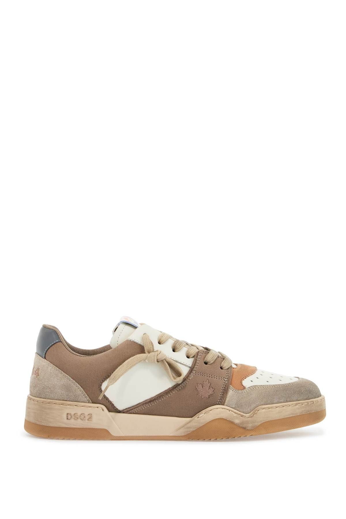 Spiker sneakers by Dsquared2 featuring colorblock upper with contrasting smooth, suede and nubuck leather inserts. Perforated toe, logo label on padded tongue, iconic side maple leaf embroidered, embroidered "1964" on heel. Fabric lining, removable insole, lived in-effect two-tone rubber sole with debossed logo on side.