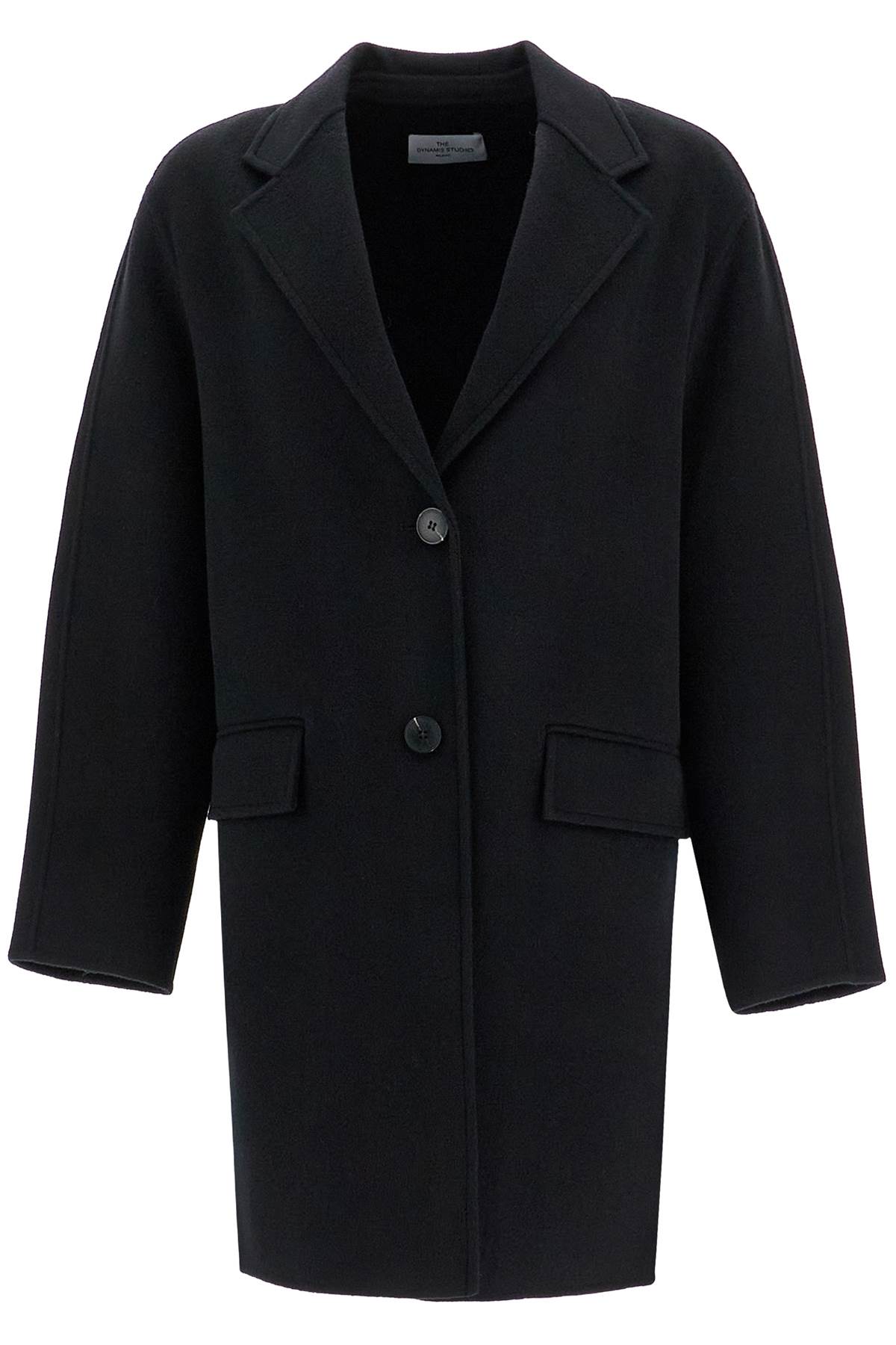 The Dynamis Studio's Oxford midi single-breasted coat is made of wool and features a boxy cut, classic lapels, flap pockets, and a central slit at the back. The model is 177 cm tall and wears an IT size 38.