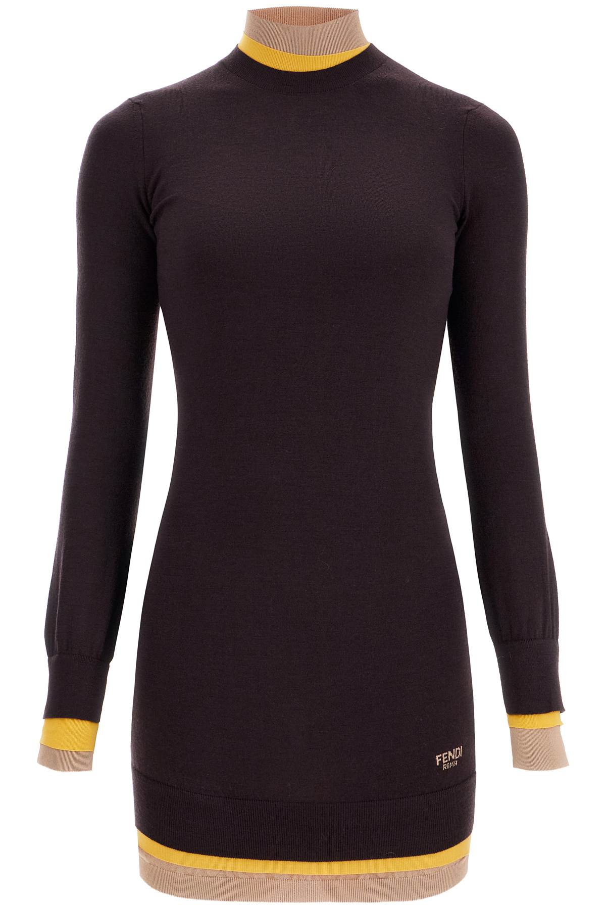 This Fendi short dress has a fitted silhouette with a high collar and long sleeves. Made of a lightweight blend of wool and viscose, it features contrasting ribbed finishes on the edges that create a layered trompe l'oeil effect. Jacquard logo at the bottom. The model is 177 cm tall and wears an Italian size 40.