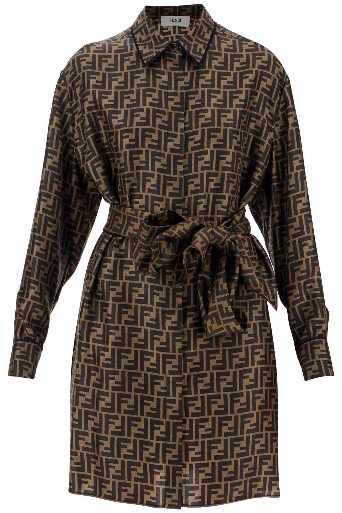 Fendi mini shirt dress crafted in FF silk twill. Its fluid silhouette is cinched at the waist with a matching sash belt, and features a classic collar, a hidden front buttoning, side pockets, and single-button angled cuffs. The model is 177 cm tall and wears a size IT 40.