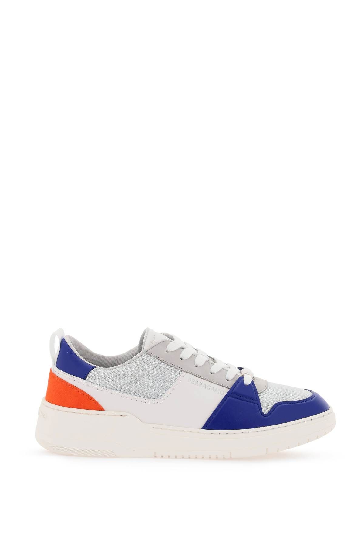 Ferragamo leather and breathable technical fabric sneakers featuring smooth leather and suede inserts in contrasting colors. Laminated logo lettering on the outer side, metal branded plate on the front lacing, tongue with embossed logo, rear pull tab in ribbon with rubber Gancini detail. Fabric lining with removable leather insole, rubber sole with printed logo on the back. Comes with spare laces.