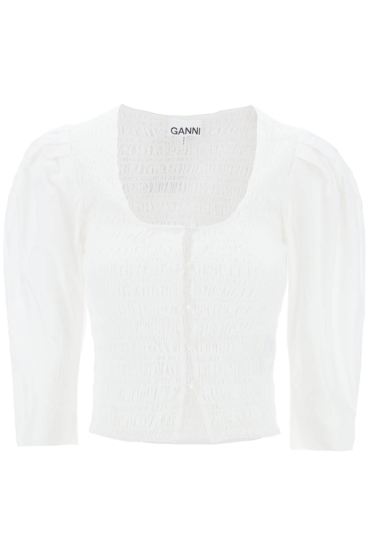 This GANNI blouse is made of organic cotton poplin and features a smocked design. It has a deep neckline and 3/4 length wide sleeves. The fit is snug with button closure. The model is 177 cm tall and wears an EU size 34.