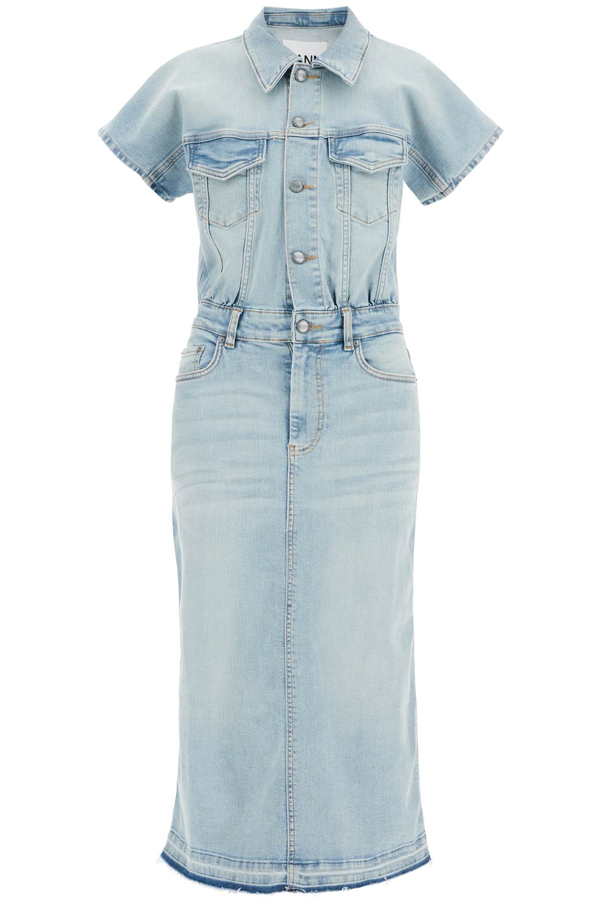 This Ganni midi dress is made of organic stretch denim and features a straight silhouette with short kimono sleeves, a shirt collar, and a five-pocket skirt. It is closed with branded buttons and a front zip, and also has two flap pockets on the chest and a central slit at the back, as well as belt loops around the waist. The model is 177 cm tall and wears an EU size 34.