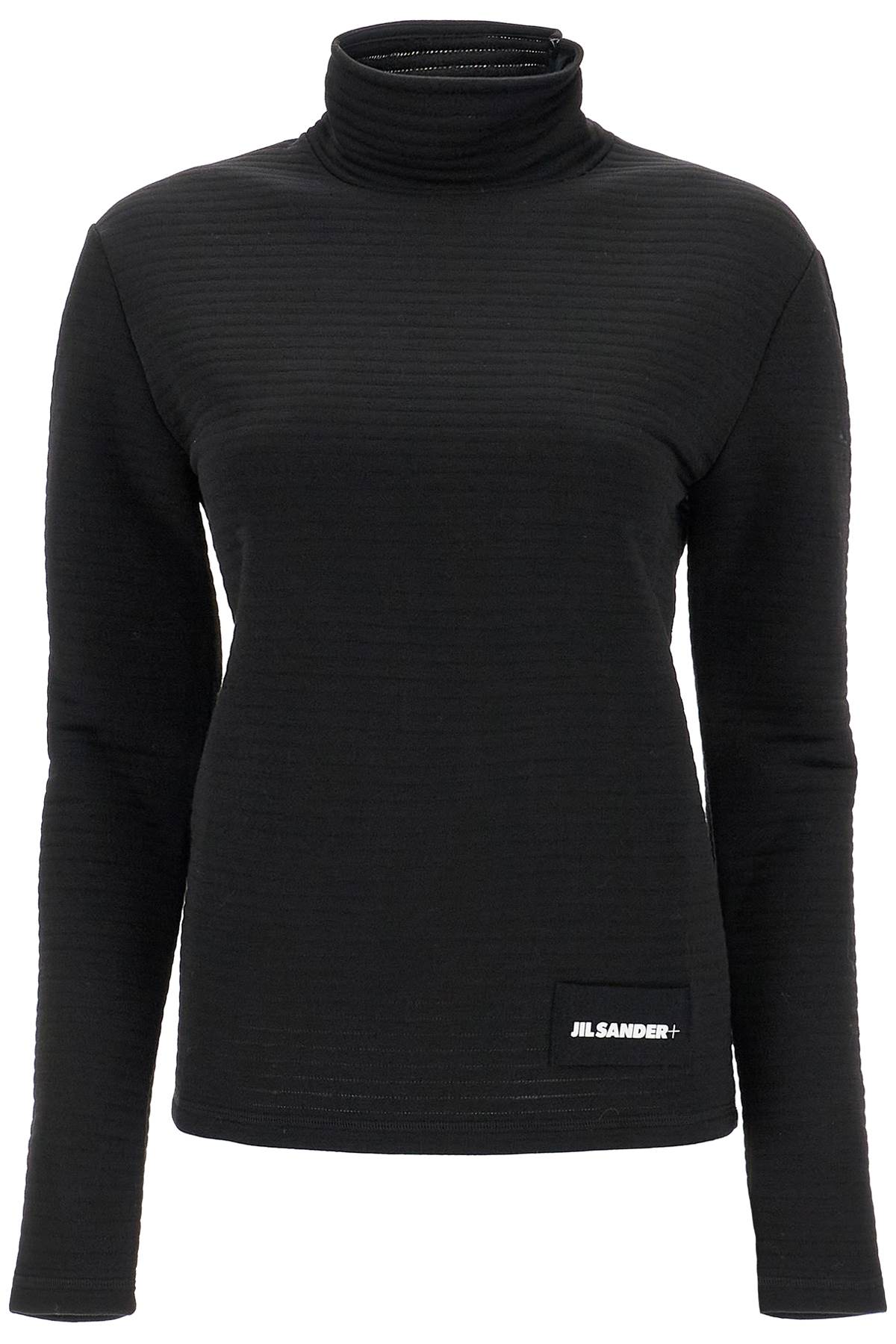 This Jil Sander+ high-neck sweatshirt is made of quilted wool blend jersey, with a straight and regular cut. It features an invisible zip closure on the shoulder and is signed with a logo label at the bottom. The model is 177 cm tall and wears a size S.