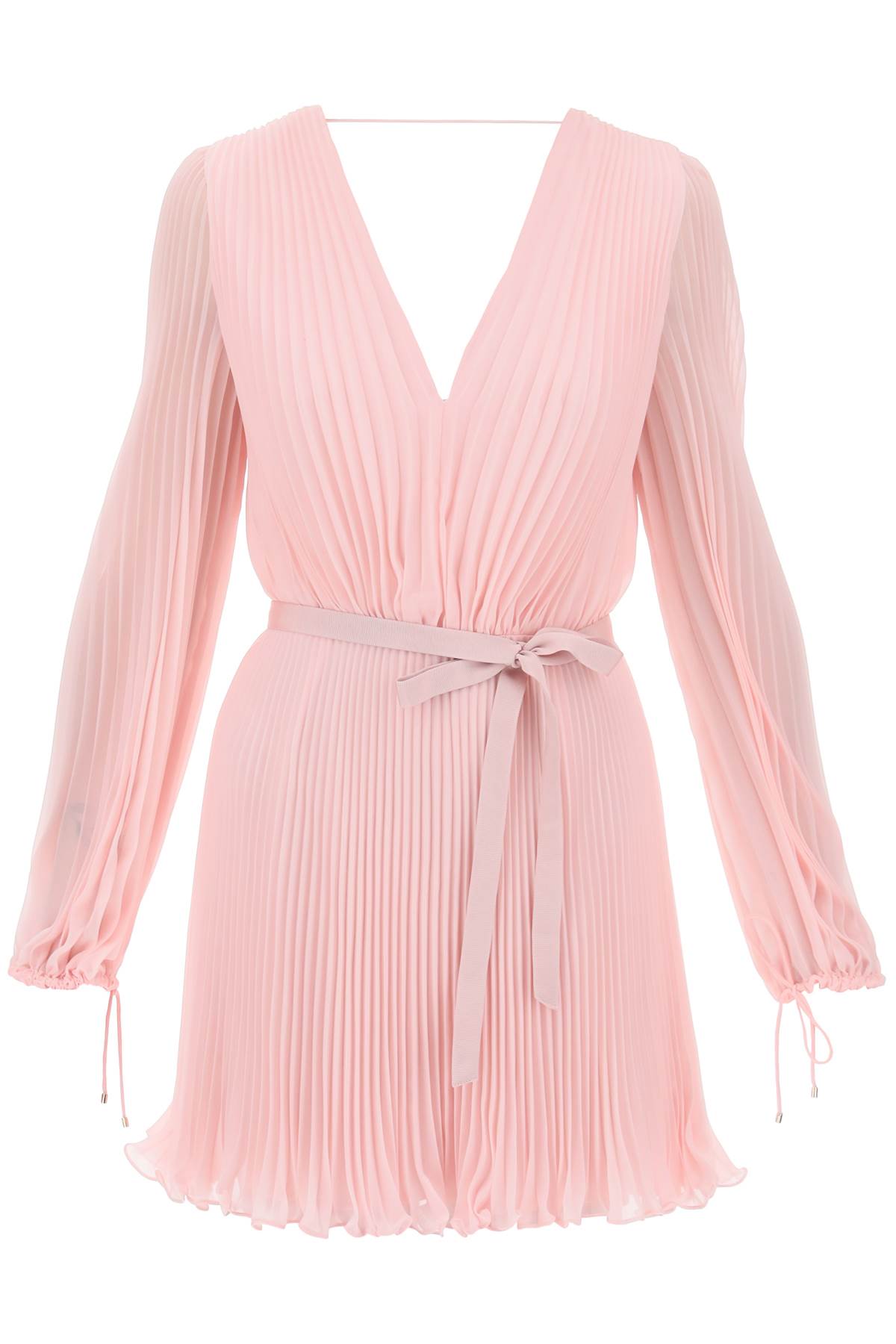 This Max Mara mini dress is made of pleated chiffon and features long puff sleeves with adjustable cuffs through knotting laces. It has a double V-neckline and an invisible zip closure at the back. Lined and equipped with a grosgrain belt that can be tied in a bow. The silhouette is slightly flared with a waist cut. The model is 177 cm tall and wears an IT size 38.