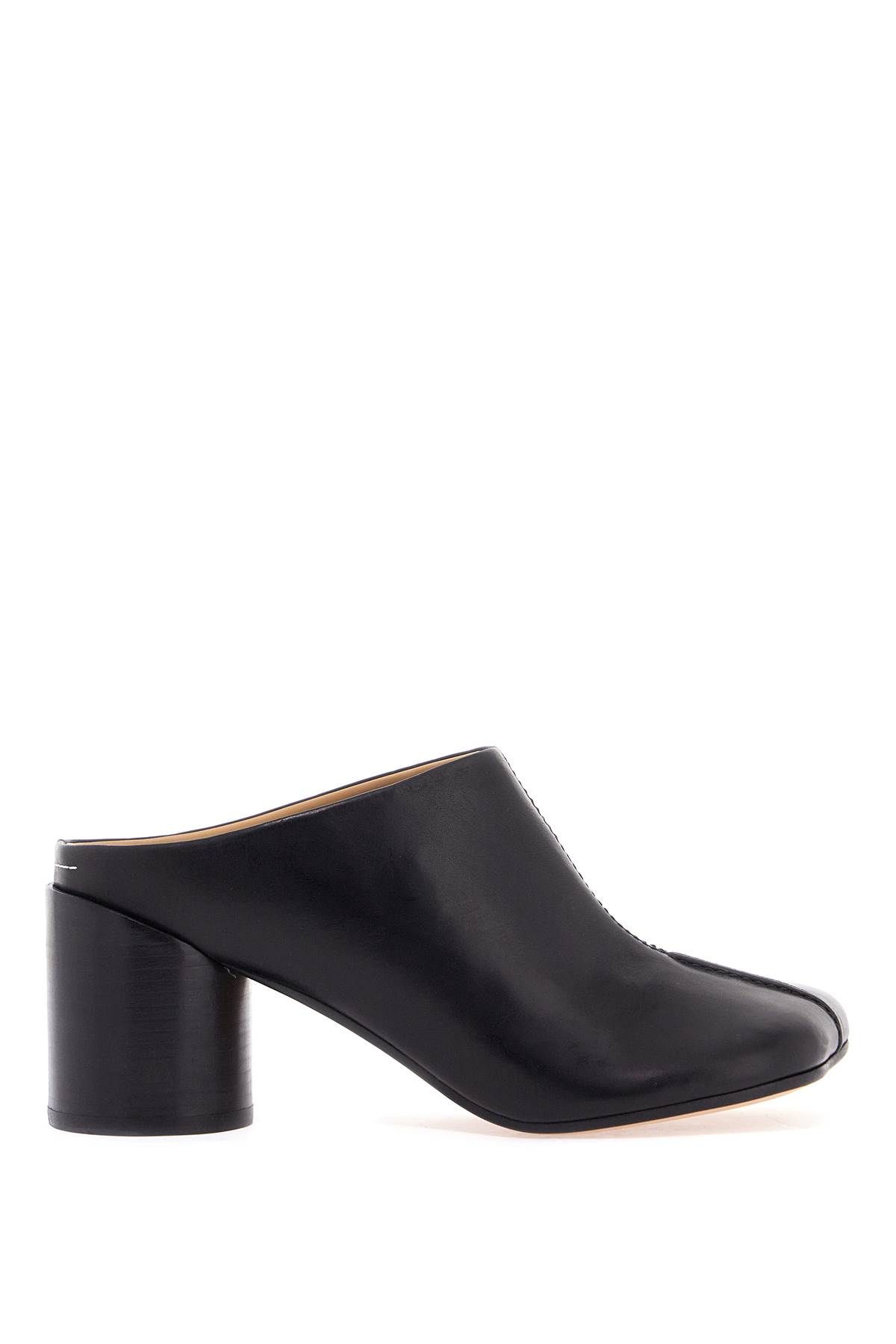 These MM6 Maison Margiela mules are made of leather and feature a pointed toe and cylindrical heel with the number six inlaid underneath. The leather insole, leather sole, and classic white stitching on the back complete the design.