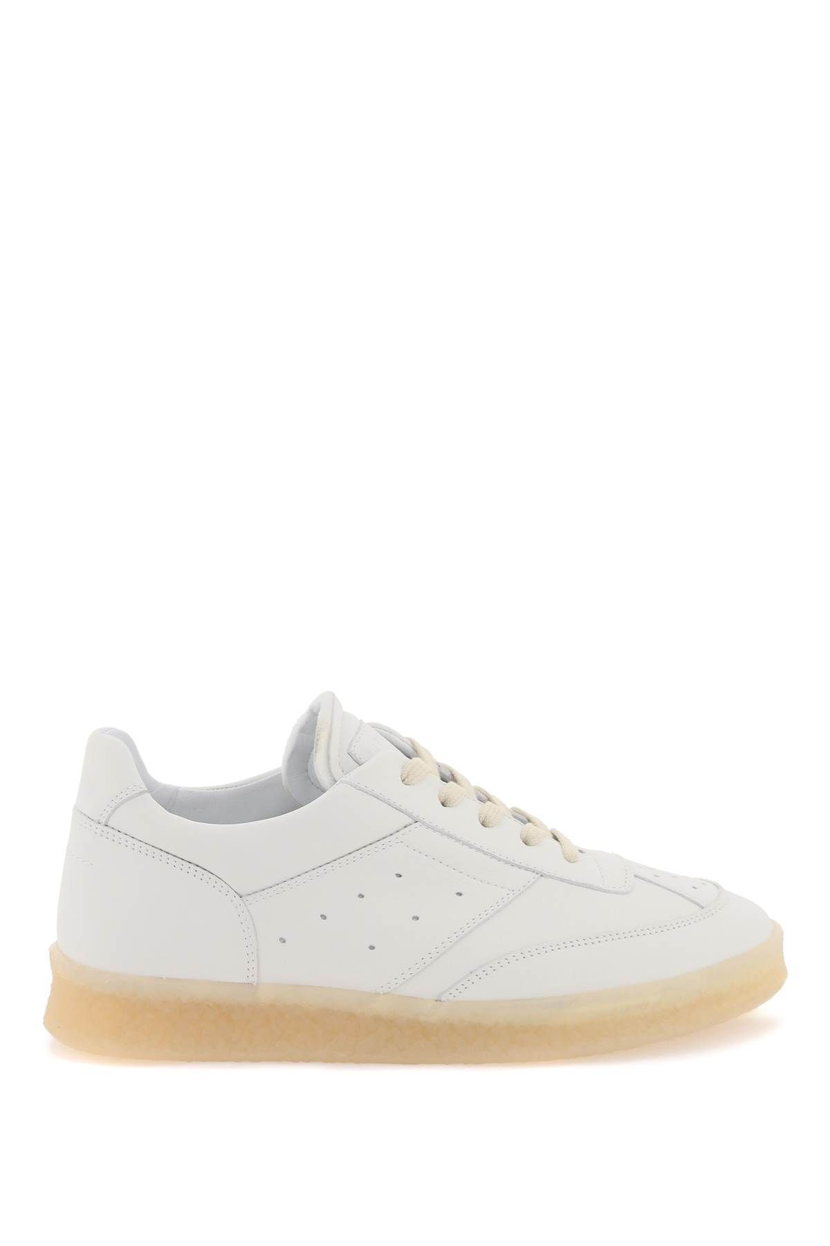 The MM6 Maison Margiela 6 Court sneakers are made of soft smooth leather with perforated sides. The numeric logo is printed on the tongue, and the interior is lined with leather and has a removable insole. The sole is made of gel for added comfort.