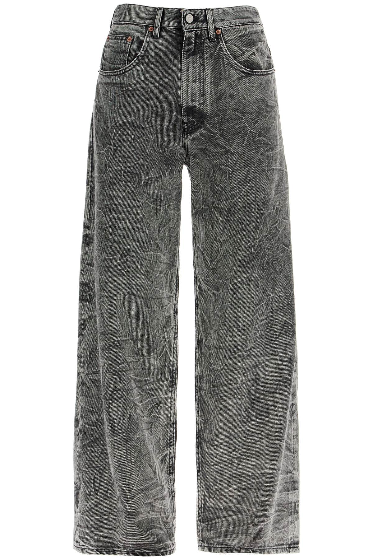 These MM6 Maison Margiela five-pocket jeans are made of washed cotton denim with a distressed effect. They feature a wide leg and a soft fit, with a hidden zip and button closure, an inner drawstring, and classic white stitching on the back. The model is 177 cm tall and wears size 26.