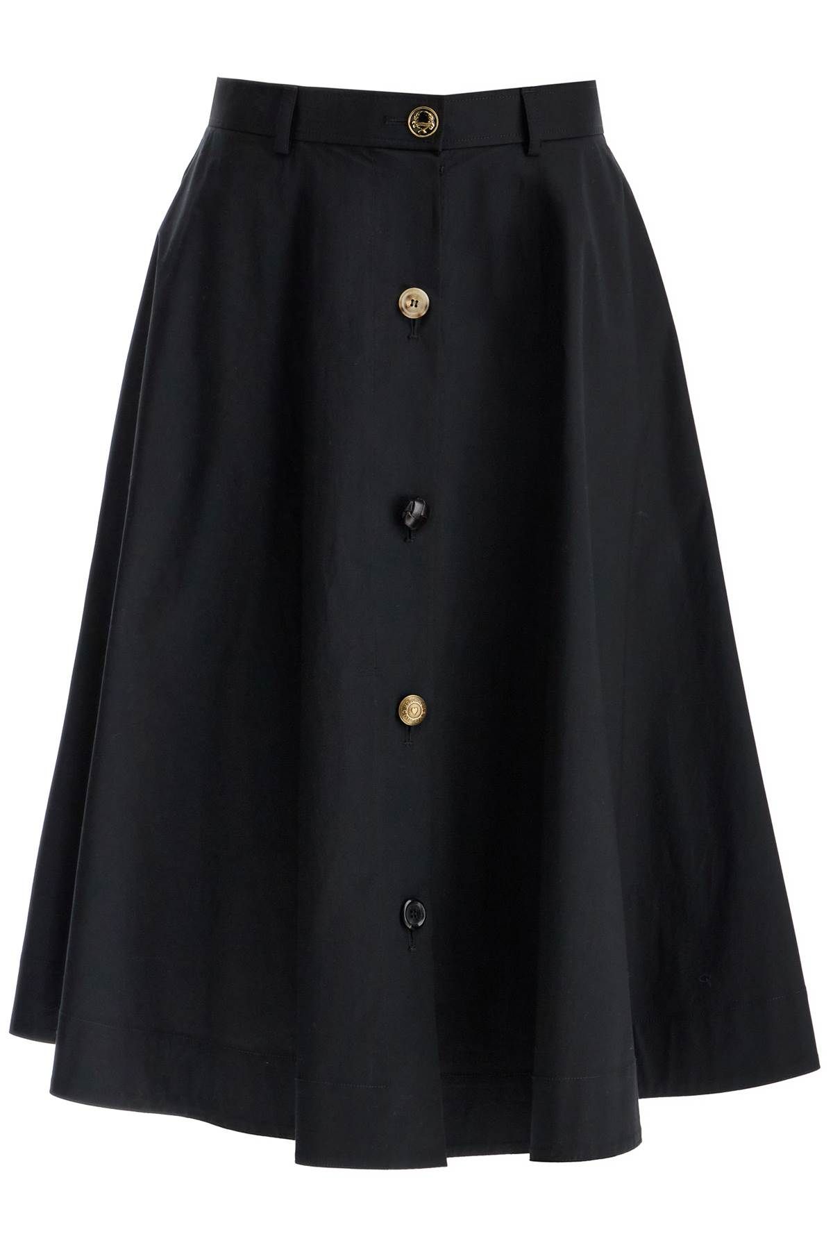This Moschino midi skirt is made of stretch cotton poplin and features a front closure with assorted buttons. It has a flared A-line silhouette with belt loops at the waist and pockets inserted in the sides. The model is 177 cm tall and wears size IT 40.