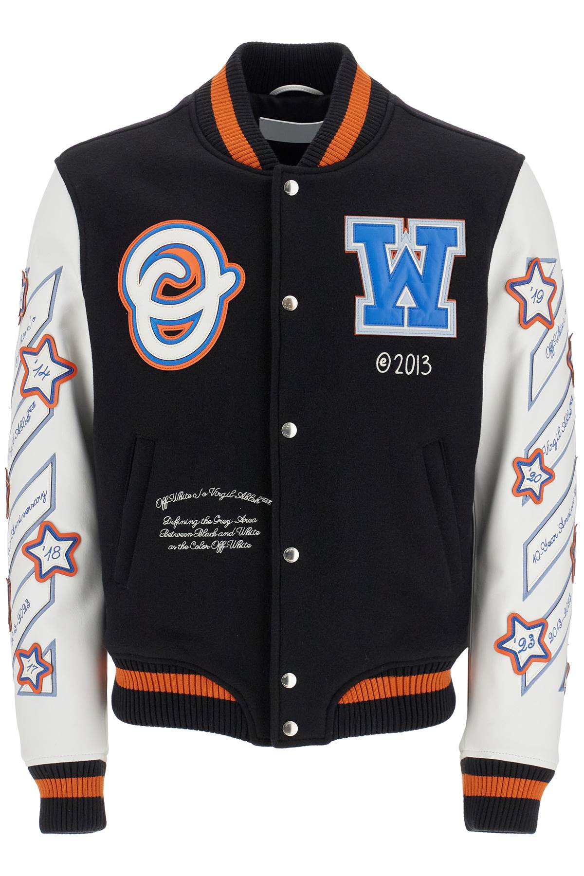 Off-White bomber varsity made of a blend of virgin wool with contrasting lamb leather sleeves, decorated with Wizard motif applications and embroidery all over the surface. It features a two-tone ribbed collar, cuffs, and hem, front snap closure, and side welt pockets. The interior is lined and lightly padded. Regular fit. The model is 182 cm tall and wears an IT size 48.