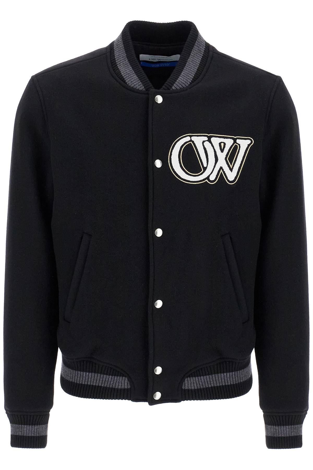 This bomber jacket from the Wardrobe collection by Off-White is made of a wool blend and features a Varsity-inspired design. It is adorned with OW patches on the chest and embroidered lettering on the back. The front has snap button closure, while the collar, cuffs, and hem are ribbed in a two-tone knit. The relaxed fit is lined with OFF jacquard twill and includes internal pockets. The model is 187 cm tall and wears a size L.
