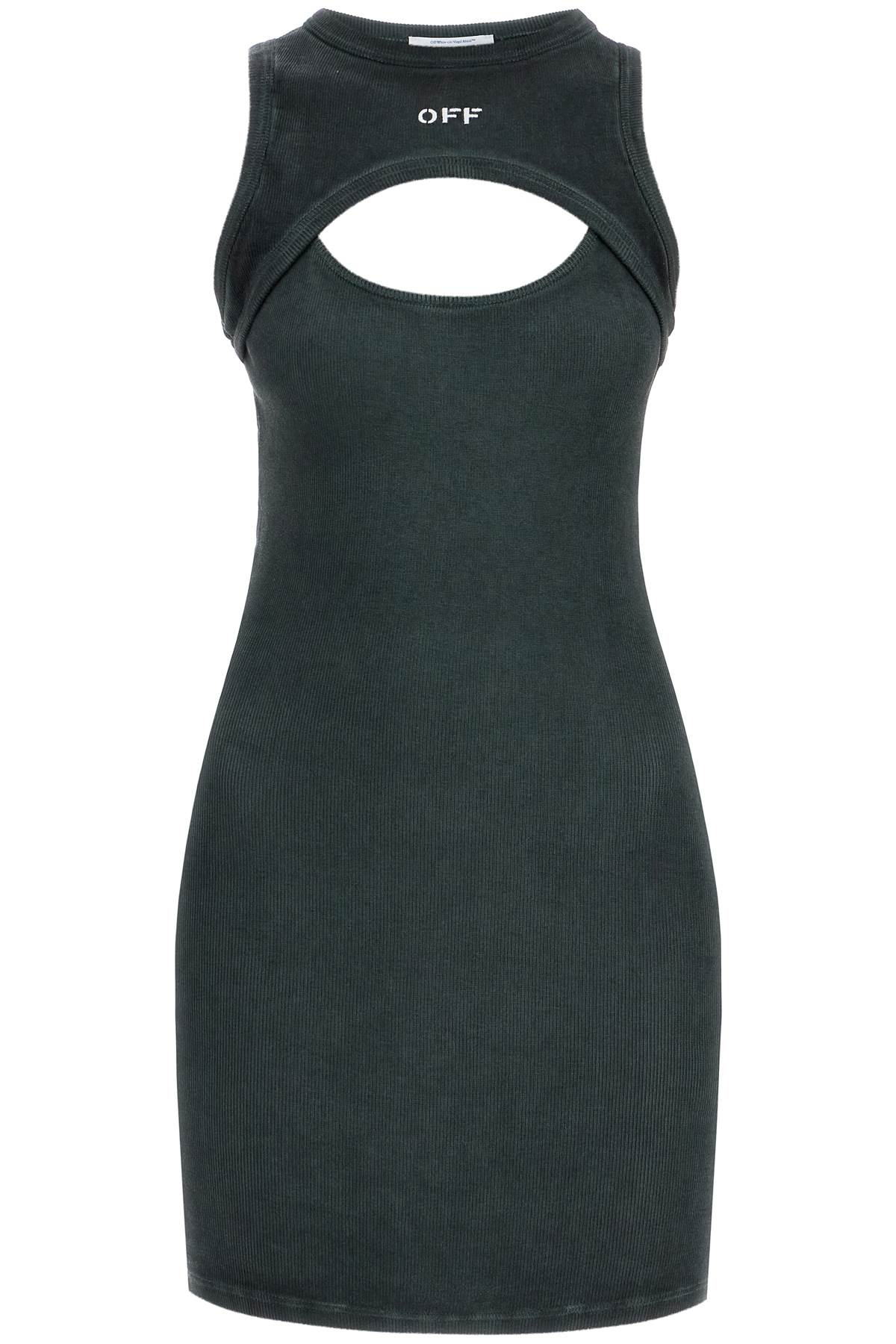 This Off-White sleeveless mini dress is made of ribbed stretch cotton jersey with a faded finish. It features a layered design and is embellished with an embroidered OFF logo on the front. The dress has a crew neck and cut outs on the chest and back. It has a fitted silhouette and the model is 177 cm tall and wears a size XS.