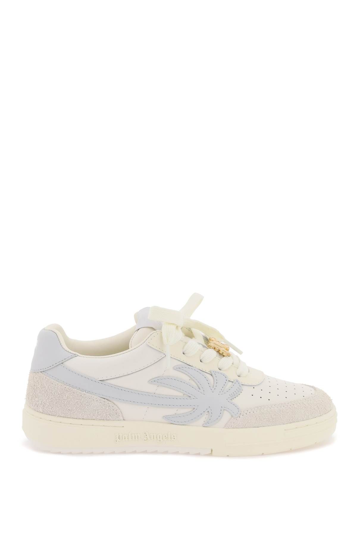 The Palm Beach University sneakers by Palm Angels are made of smooth quilted leather with suede inserts and an iconic contrasting leather palm tree applied on the side. Perforated toe, removable monogram in golden metal on the laces, logo embossed on the contrasting spoiler, logo label on the tongue. Fabric interior with removable leather insole and serrated rubber sole.