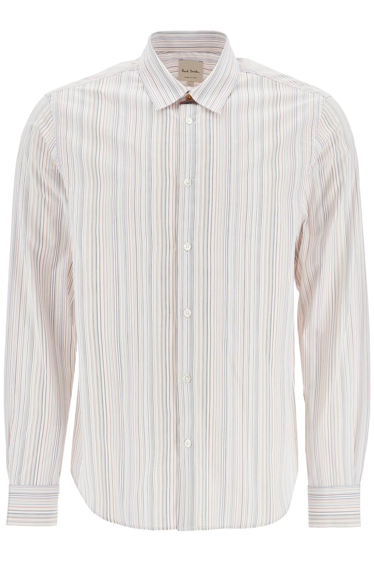 Made from cotton poplin with a slim fit, this Paul Smith shirt is characterized by a subtle multicolored stripe pattern. It features a classic Italian collar, rounded cuffs, and mother-of-pearl buttons. The model is 182 cm tall and wears size L.