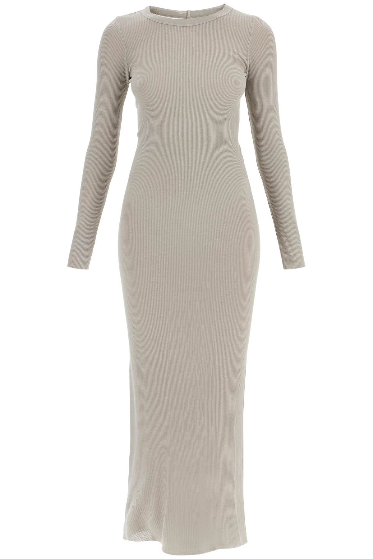This long dress by Rick Owens is made of semi-transparent stretch silk and viscose jersey, with ribbed detailing. It features a fitted design with a round neckline, long sleeves, raw-cut hems, and a central seam on the back. The model is 177 cm tall and wears an Italian size 40.