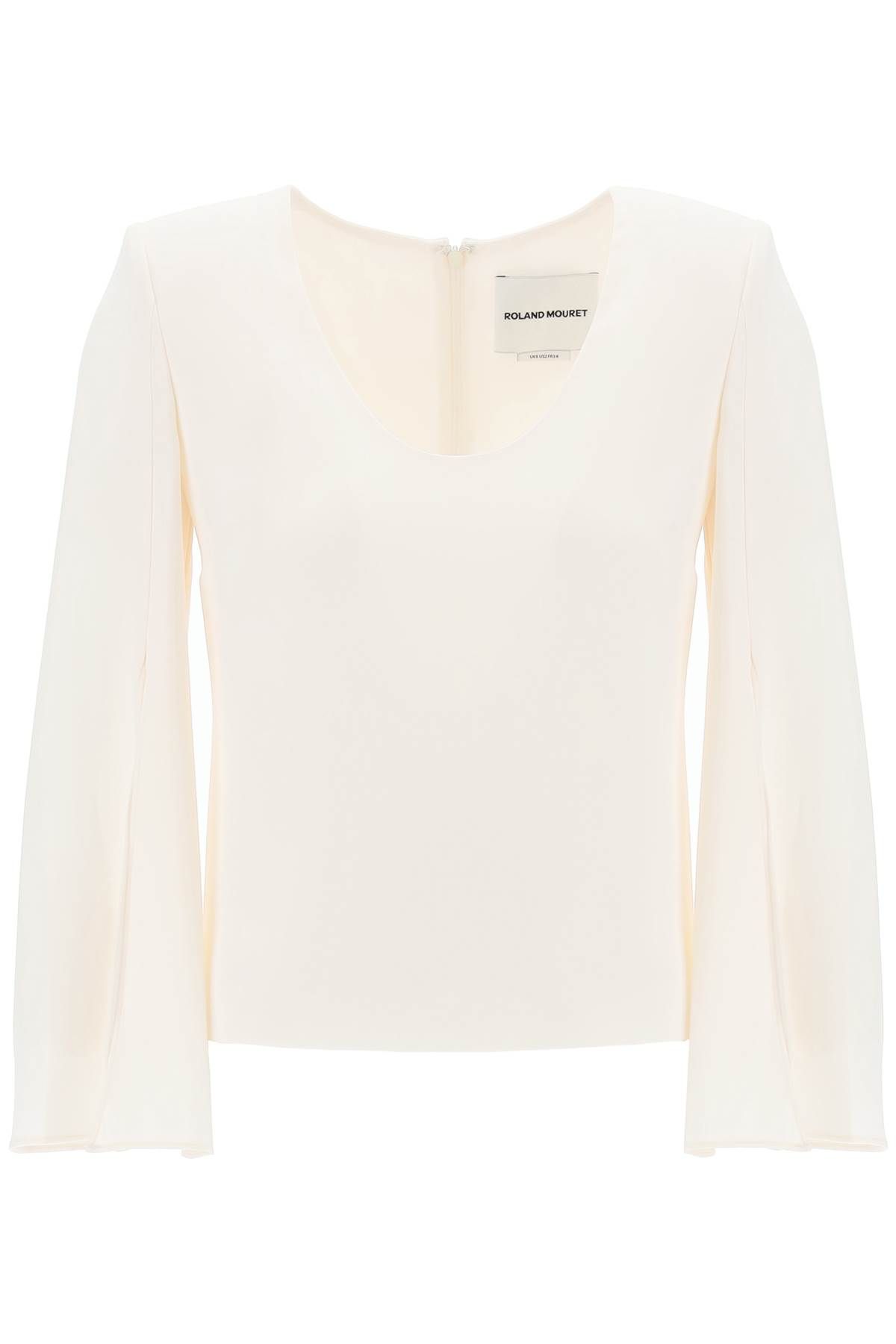 This Roland Mouret top is made of regular fit cady and acetate blend. The design features a U-neckline, flared sleeves with slits, and an inner lining on the main body. It also has a hidden zip closure at the back and removable padding in the shoulders. The model is 177 cm tall and wears a size 6 UK.
