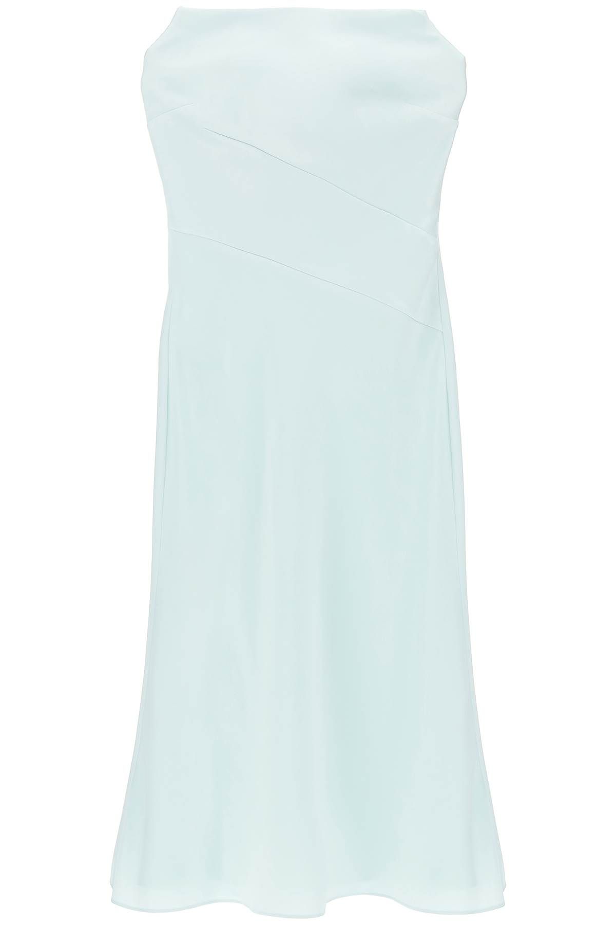 Crafted in satin crepe for a fluid effect, Roland Mouret's midi dress features a strapless design with a straight neckline customized by a draped detail at the waist. The top is characterized by an internal corset structure with a band at the waist and snap button closure. Hidden zip closure at the back. Fitted silhouette and flared at the bottom. The model is 177 cm tall and wears a size 6 UK.