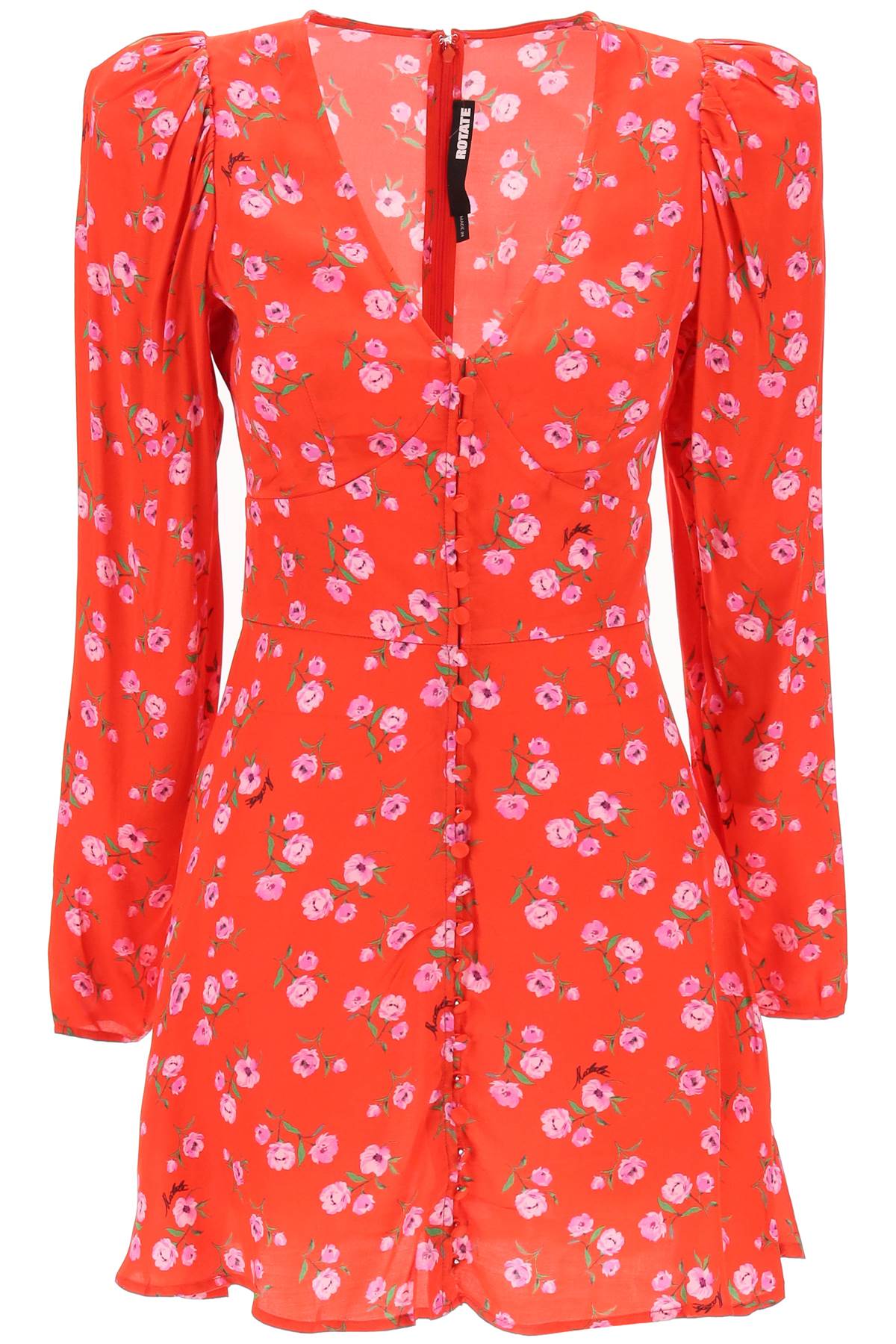 This mini dress features a floral pattern and is made of Circulosa satin blend with long sleeves and a deep V-neckline. It is embellished with organza inserts on the shoulder straps and covered buttons, and has a flared skirt and invisible zip closure at the back. Unlined. The model is 177 cm tall and wears an EU size 36.