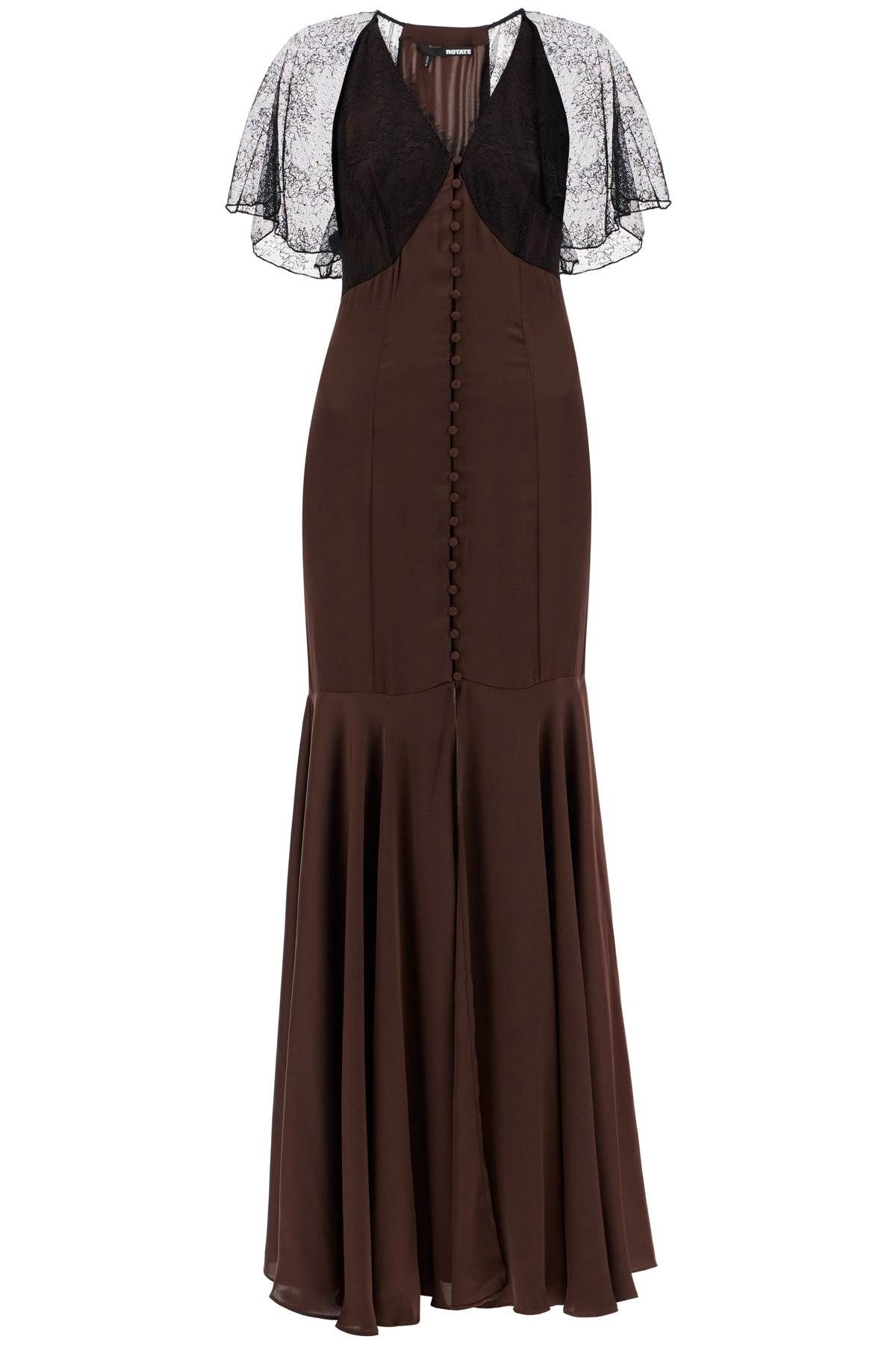 The Rotate long dress is made of recycled poly-satin with a lace bodice and short sleeves. A deep V-neck frames a fitted silhouette that flows into a flared hemline. The design is completed by a row of buttons on the front and a central slit. An invisible zipper is located on the side. The model is 177 cm tall and wears size FR 36.