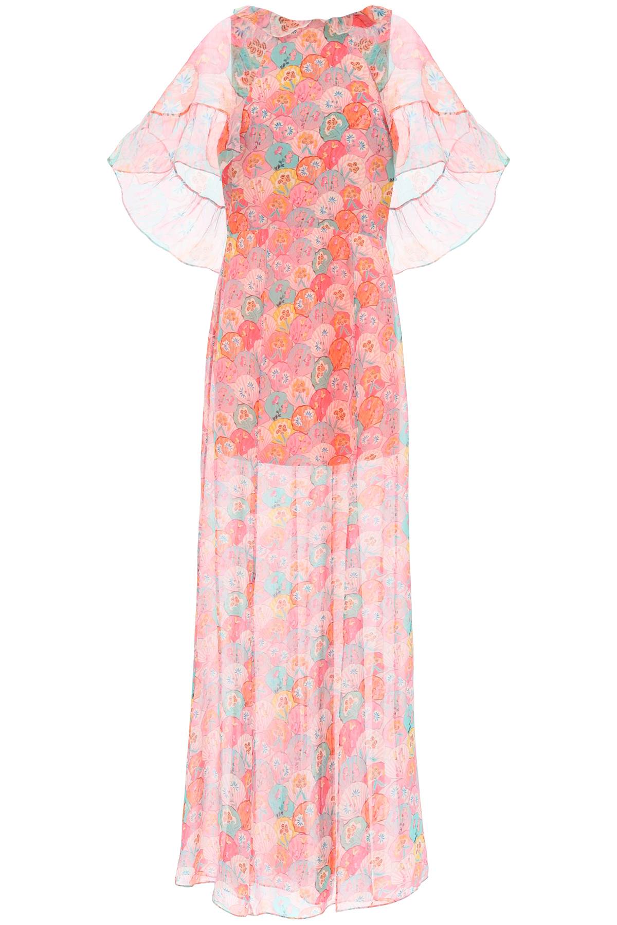 The Natalia maxi dress by Saloni is made of pure silk georgette with a shell and floral print all over. The design features short cape sleeves, a ruffled neckline, and a side slit at the bottom. It comes with an inner lining and a hidden back zip closure, creating a soft silhouette. The model is 177 cm tall and wears a UK size 12.