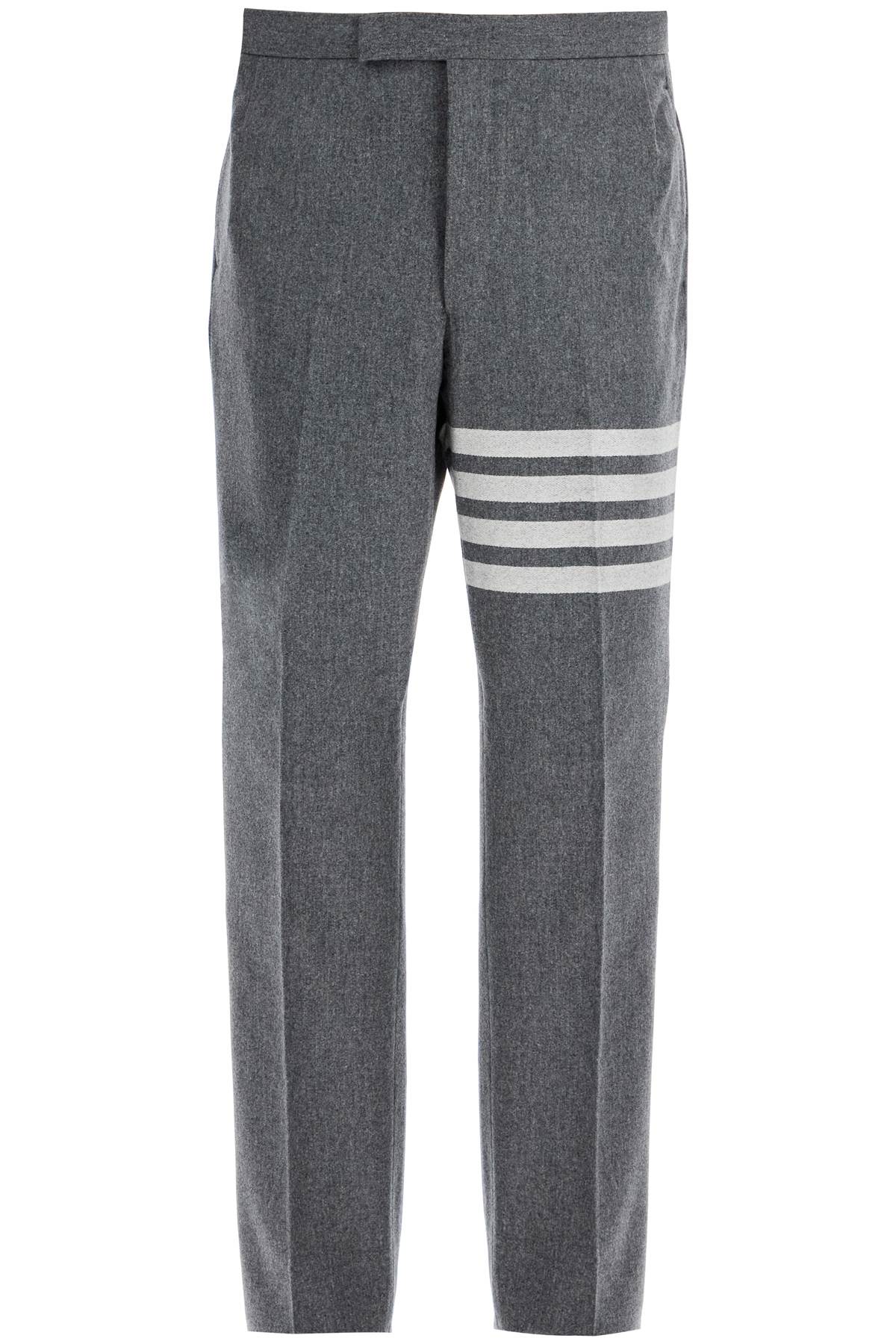 Thom Browne trousers made of wool and cashmere from the tailoring line, decorated with iconic 4-bar on the left leg. They feature button and hook closure, French pockets, two welt pockets on the back, and an adjustable back strap with tricolor grosgrain ribbon. The model is 187 cm tall and wears size 2.