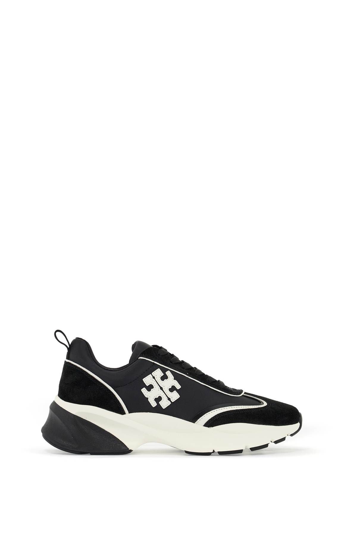 The Good Luck Sneakers by Tory Burch are made of technical fabric and suede leather with contrasting smooth leather details, including the monogram patch on the side. They feature a back pull tab in ribbon, a fabric lining with a removable preformed sponge insole, and an oversized ergonomic sole with sculptural curves. Spare laces are included.