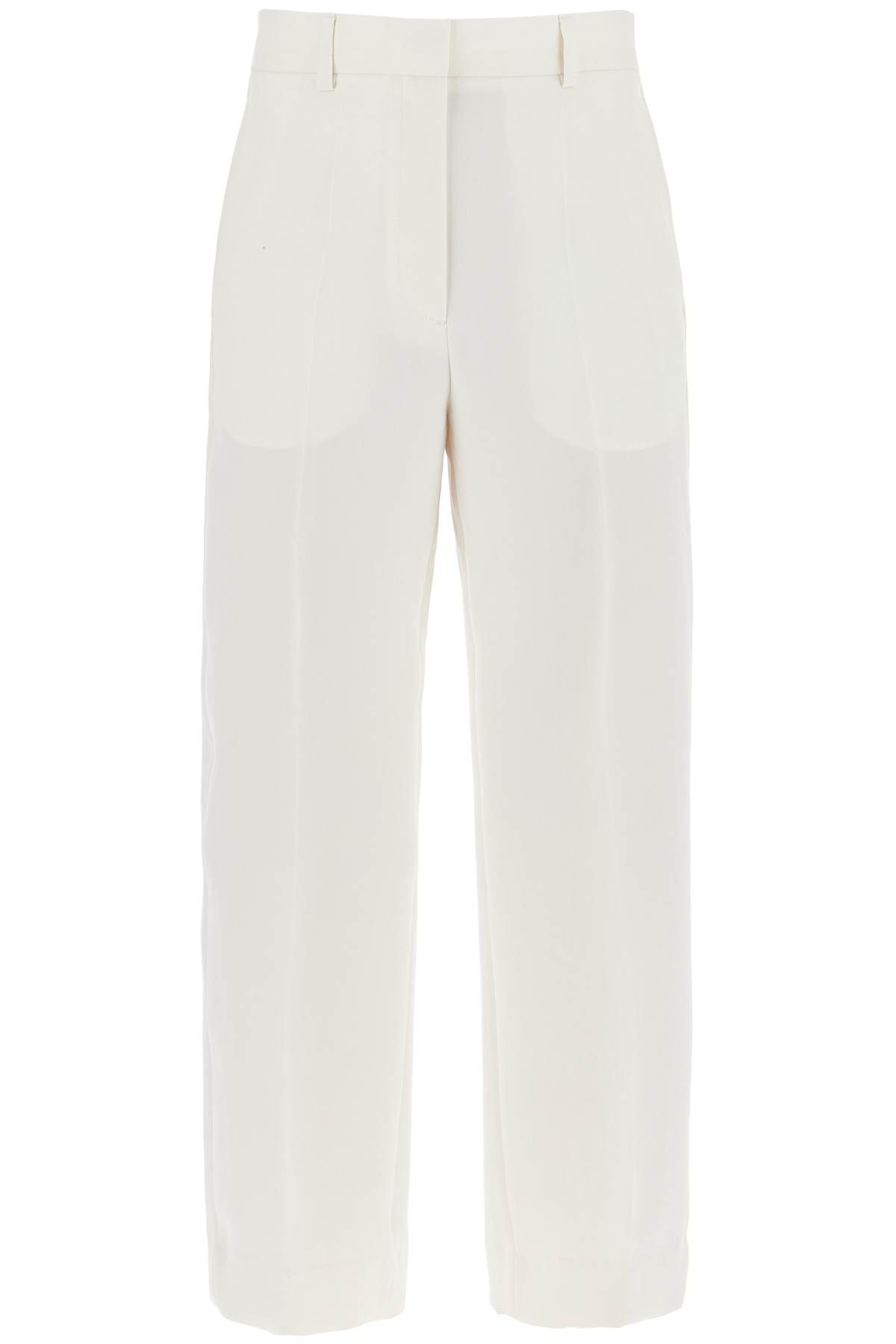 These Toteme cropped pants are made from fluid viscose fabric, with a medium waist and straight leg featuring the classic tailored detail of pressed pleats. They have a zip and concealed hook closure, side pockets, back welt pockets, and belt loops. The model is 177 cm tall and wears an EU size 34.