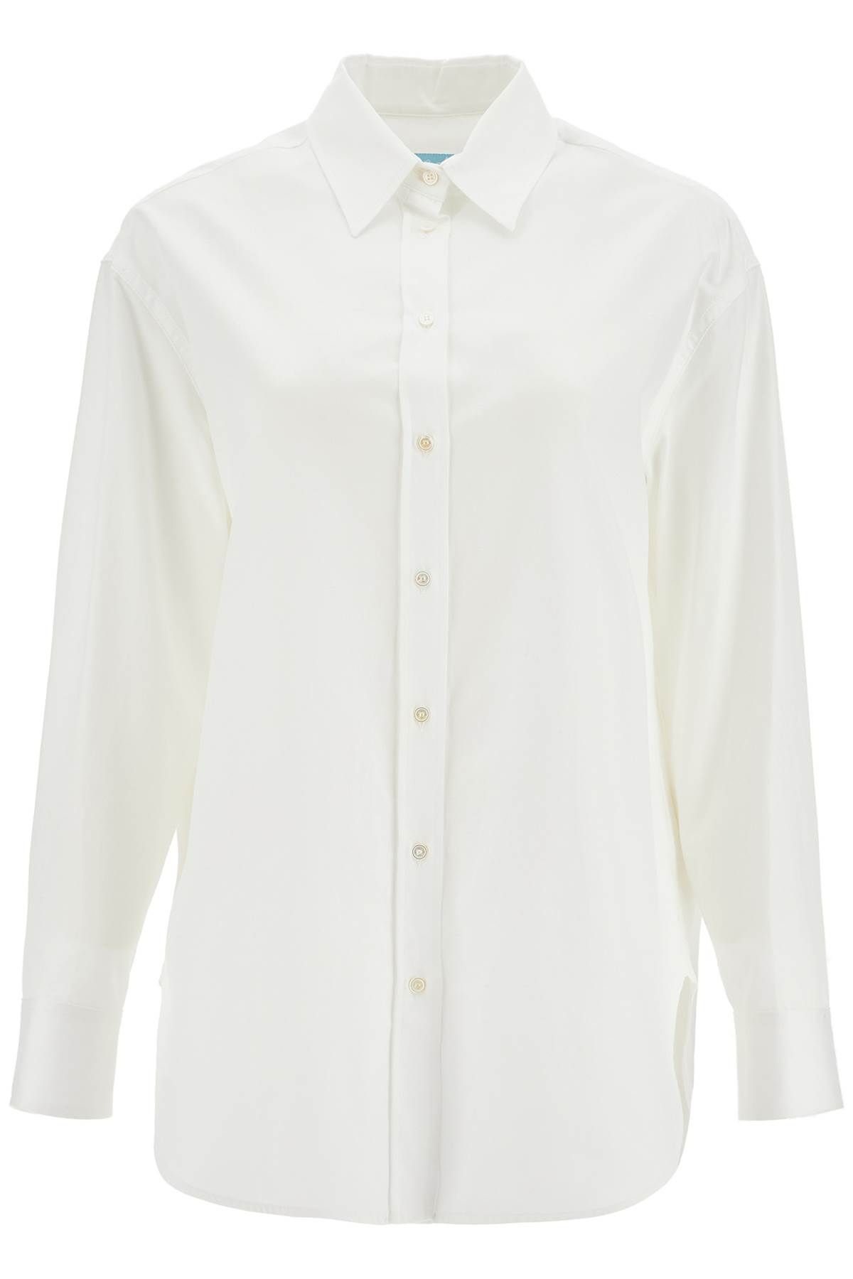Introducing the oversized shirt from JoyRoad's collection by Luci Hale x Weekend Max Mara. Made of pure cotton twill, this shirt features a rounded and slightly asymmetrical hemline, adorned with an embroidered flower on the first front button and cuffs. It also has a classic collar and a back yoke with a pleat detail. The model is 177 cm tall and wears size IT 38.